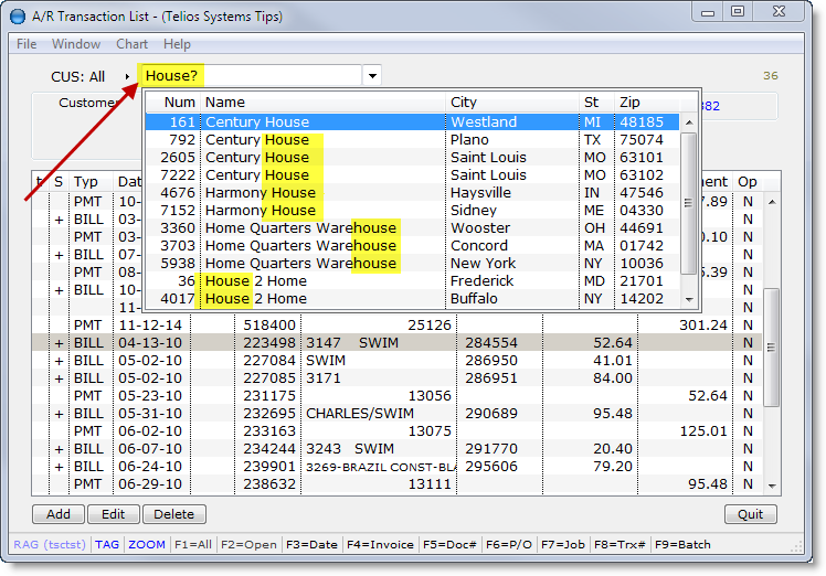 We have changed that to automatically open the popup window displaying all the matching records in the list. An example is the main A/R Transaction list window:
