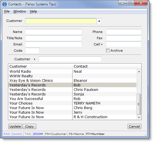 The first field will receive the focus. The button captions change to Update, Copy, and Cancel.