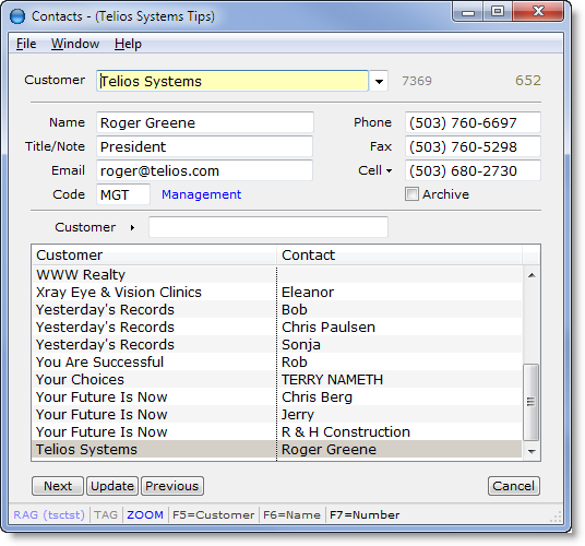 When you are finished with the fields, the focus will drop to the Update button. Press ENTER to complete the add or Cancel to abort. The new record will display in the List at the bottom: