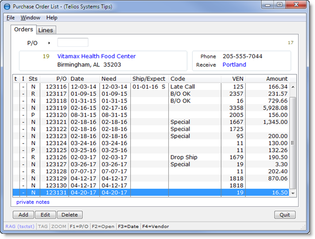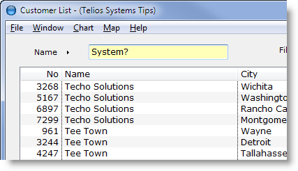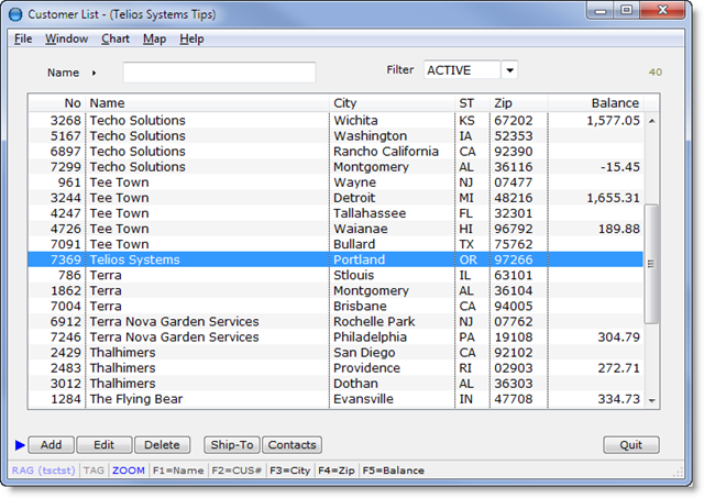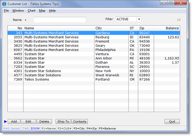 On most programs that add or edit records in a table, the first window display is a list of records. Here is the main list for the Customer master in Accounts Receivable: