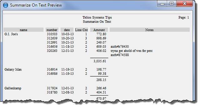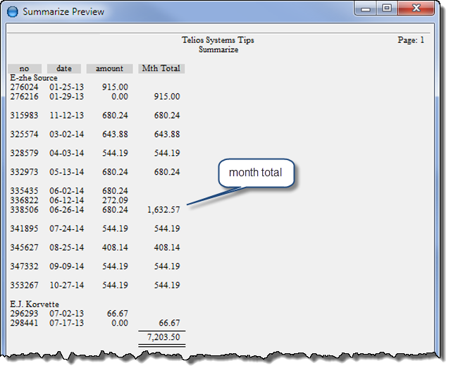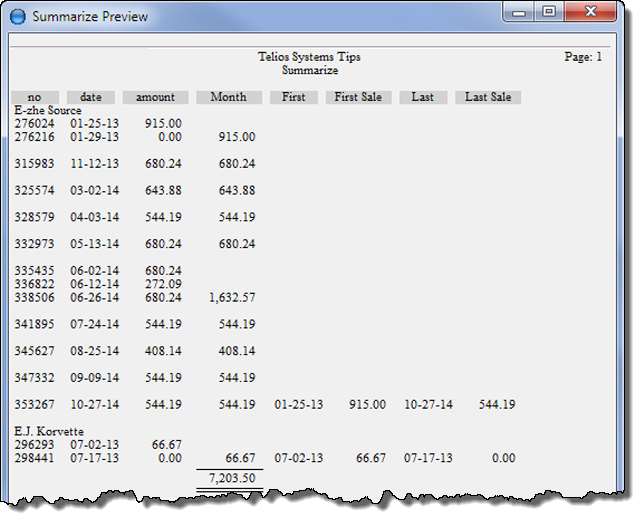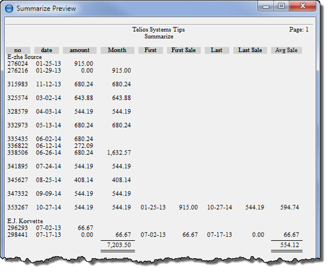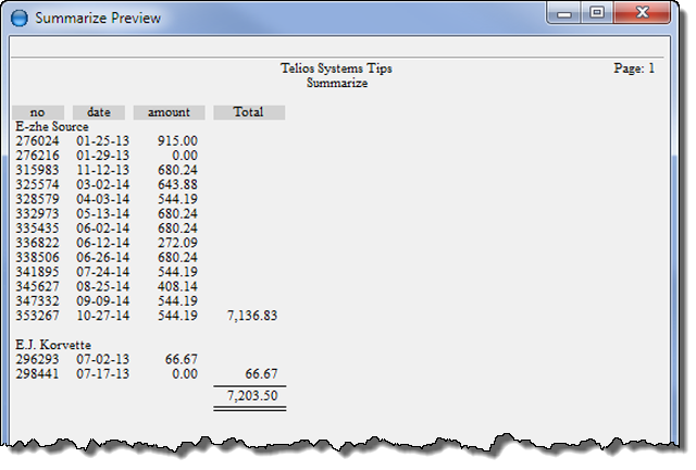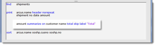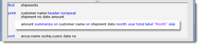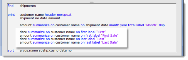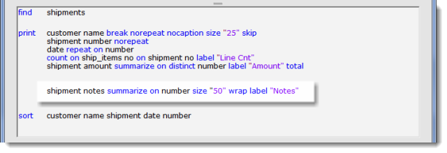 Where break will print totals under an existing column, summarize prints its values in a separate column. - For date and text fields, summarize acts as a filter rather than an accumulator. The on arguments determine when the date or text field prints.
