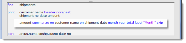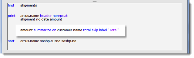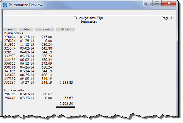 - summarize on customer name — customer name is the filter. When the customer name changes the amount will print.