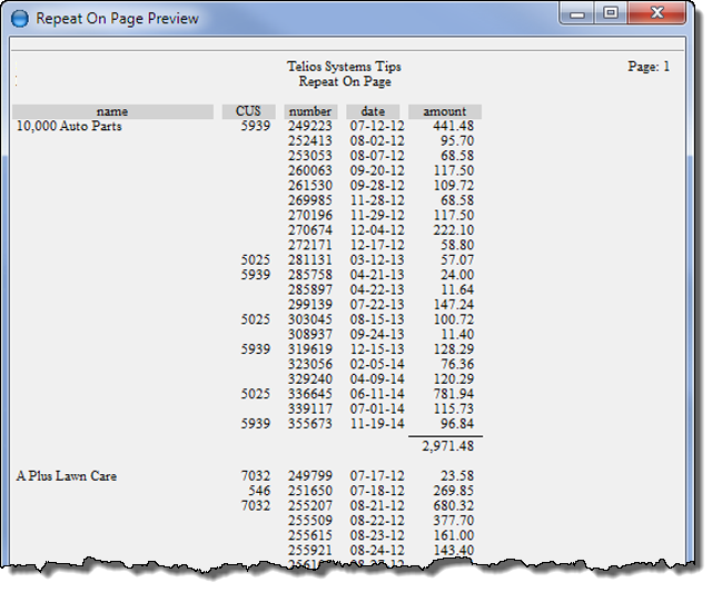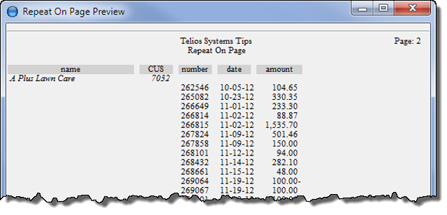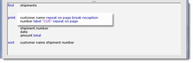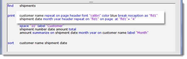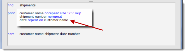 2. repeat on — accepts modifiers. Whenever the target field or any one of the modifiers change, the field prints.