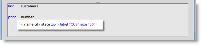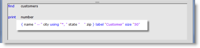 - Between the city and state fields we introduce a mask with the using reserved word. The mask allows us to make the literal separator conditional. If the city field is not blank for a customer then use the mask. The asterisk means to replace the value of city where the asterisk is. If we just used another literal here, like “, ” (comma space) then a blank city field for a customer would leave an orphan comma.between the name and the state.