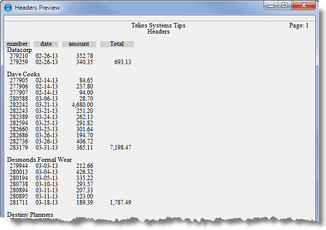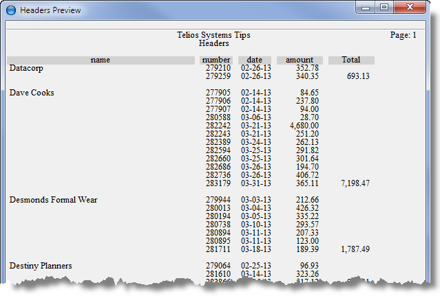 This report prints a customer name, then shipment number, shipment date and shipment amount for each customer. The sort order is set to customer name then shipments by date.