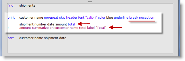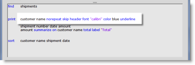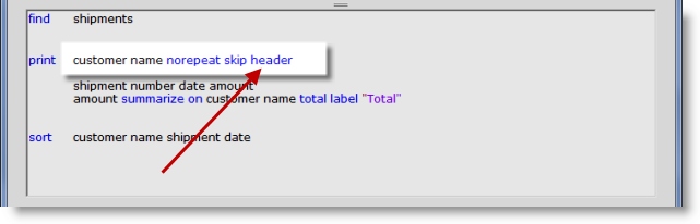 The norepeat word on the customer name prevents the customer name from printing on every line (since every shipment document has a customer). The skip word puts a blank line between customers.