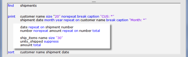 - number norepeat — Since we’re now printing all the line items for each shipment, we put a norepeat on the (shipment) number column.