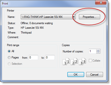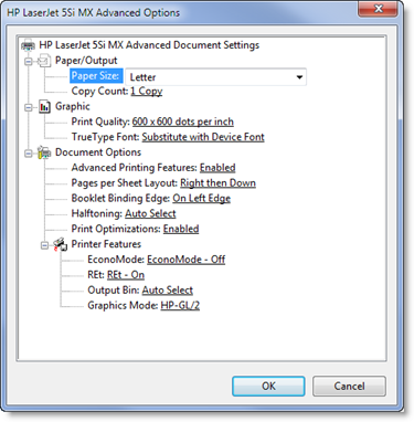 The printer above is for an HP 5si duplex printer with three output trays, and an envelope feeder. The settings are for 1/2 inch margins top, bottom, left and right, using tray #2 for 8-1/2 x 11 inch paper, single sided — named “BIG”.