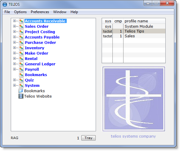 On the left side is a tree view of programs that you can access for the highlighted profile. On the above display, the profile is named Sales. There are two other profiles assigned to this user. The Telios Tips profile looks like this: