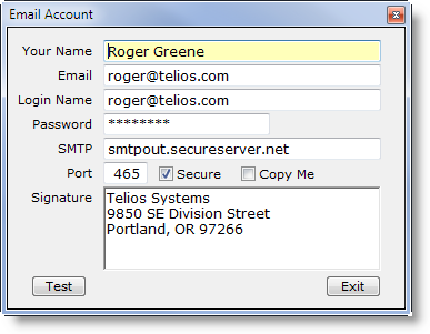 - Email Account — In many of the reports, an export options is Email. The email account that the report used as the SMTP client is entered with this option. When you click on the Email Account a window will display with the email options: