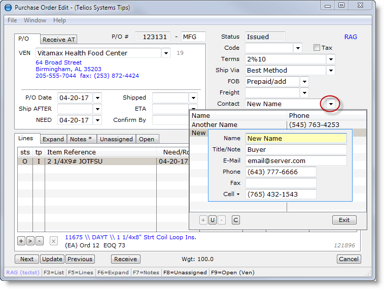 You can also add, edit and delete contacts directly in the Purchase Order edit window: