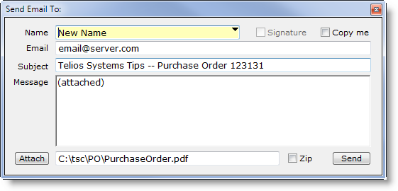 Select the Email option for the email dialog. The Purchase Order is generated as a PDF attachment: