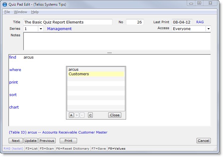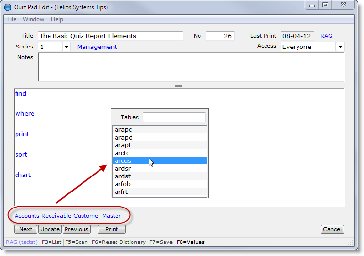 The Customer table is most likely in Accounts Receivable. If we then press T (for Tables), the popup display will list only the tables in Accounts Receivable: