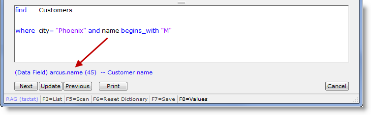 Word number 2 is where. The arguments for where are conditions to filter the information that you want to print. The conditions can include fields in the find target table, or any other table that is remotely connected to the find table. The possibilities are limited only to the ability to fetch the information between tables. (And if it is possible, Quiz will find the way).