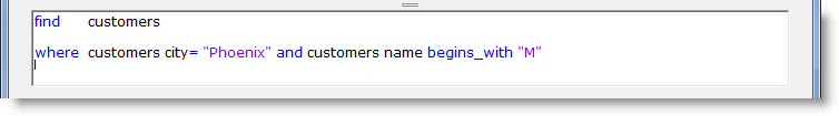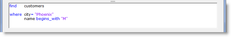 The and is assumed as the default between the conditions. “Phoenix” and “M“ are literal values and are enclosed with quotation marks. begins_with is a synonym for the operator =|.