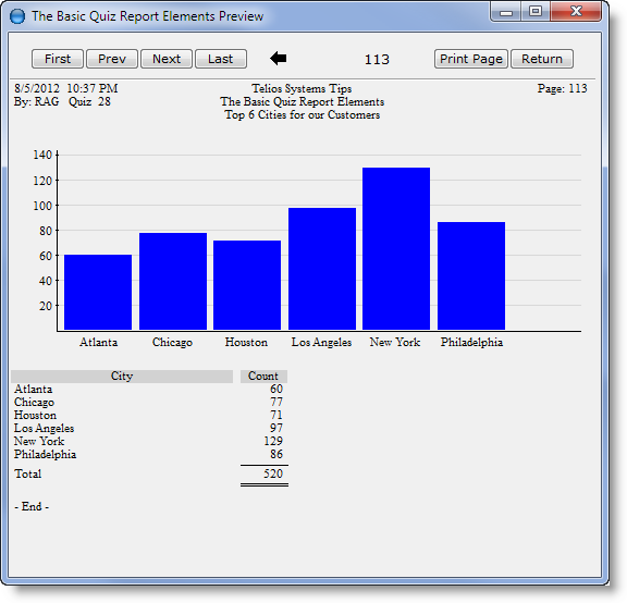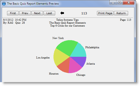 To create a chart takes just three lines on the Quiz report. For our example, we’re going to chart the number of Customers in the top 6 cities. The chart lines look like this: