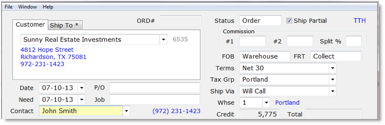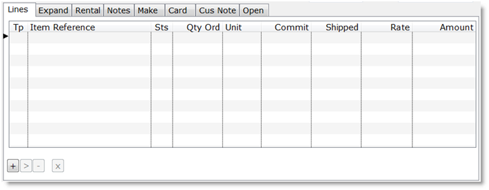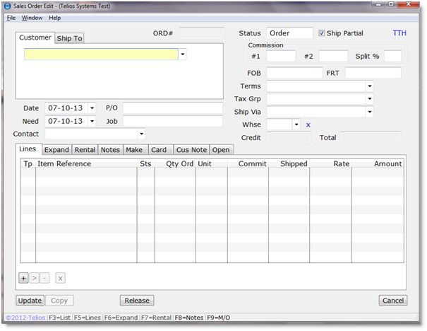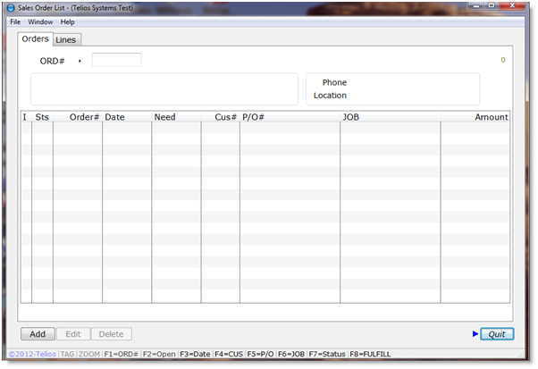 Press “A” to add a new order. The list will hide and you will be taken to the Sales Order Edit window. For more on list windows, see: List Window. For more on edit windows, see: Edit Window.